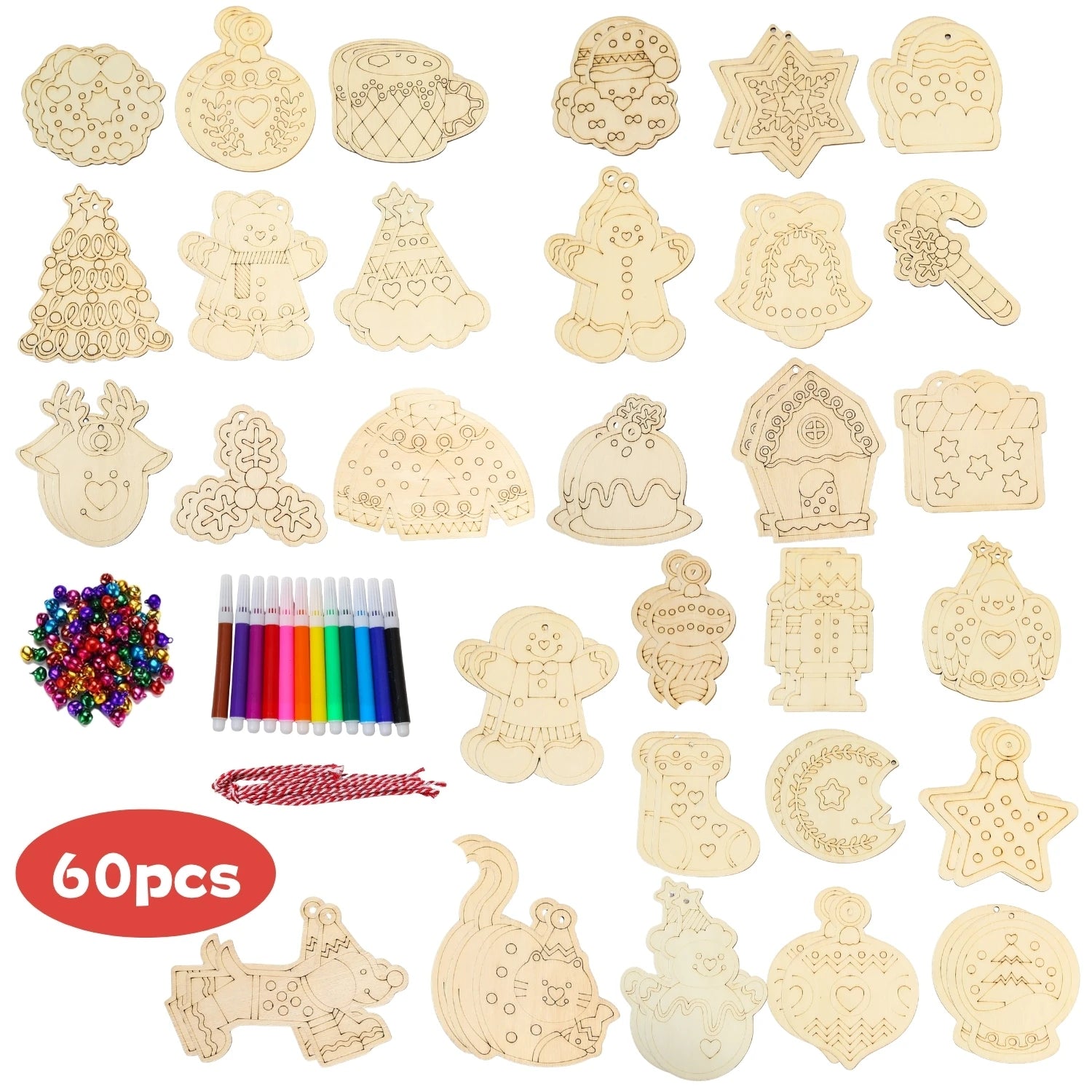 Zestaw 60 drewnianych ozdób choinkowych – 30 wzorów zawieszek do personalizacji, idealne dekoracje świąteczne i prezenty DIY